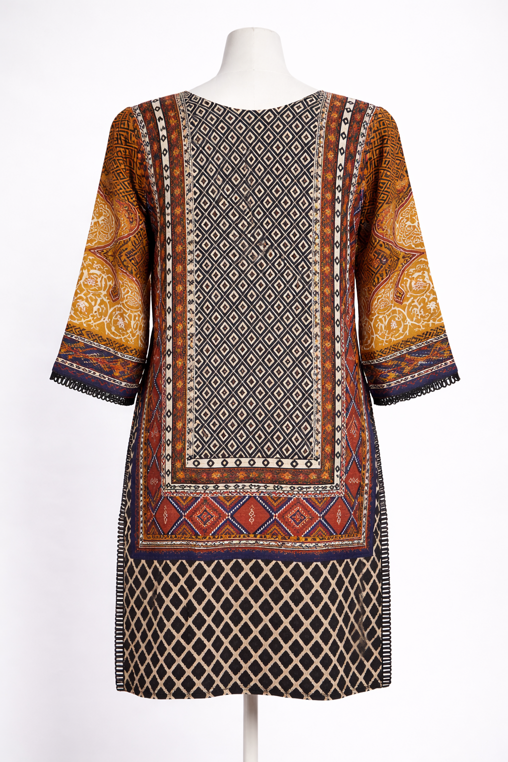 Add a bold ethnic touch to your wardrobe with this stunning multi-color printed kurta. Featuring a striking tribal/folk-inspired digital print in rich tones of blue, mustard, red, and black, this kurta blends traditional design with a modern, relaxed silhouette. The round neckline and straight cut make it easy to wear and style, while the long sleeves are finished with delicate lace trim for a refined look. The contrasting printed hem and side detailing create a beautifully balanced design from top to bottom.