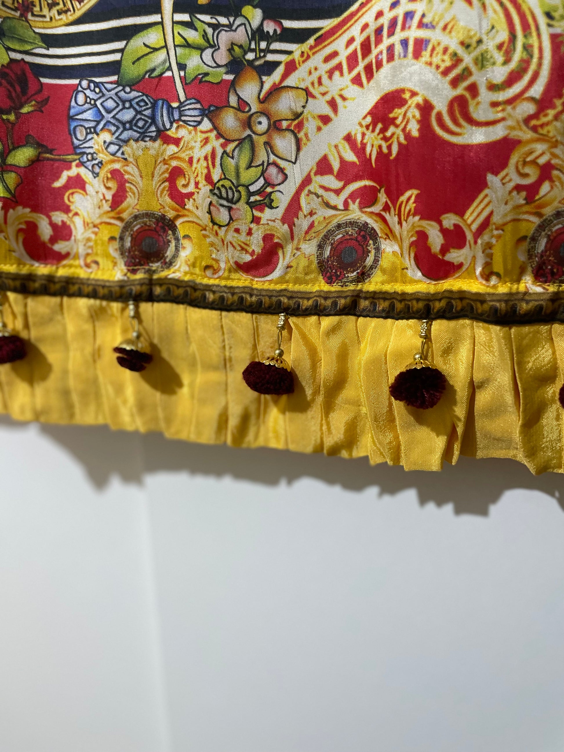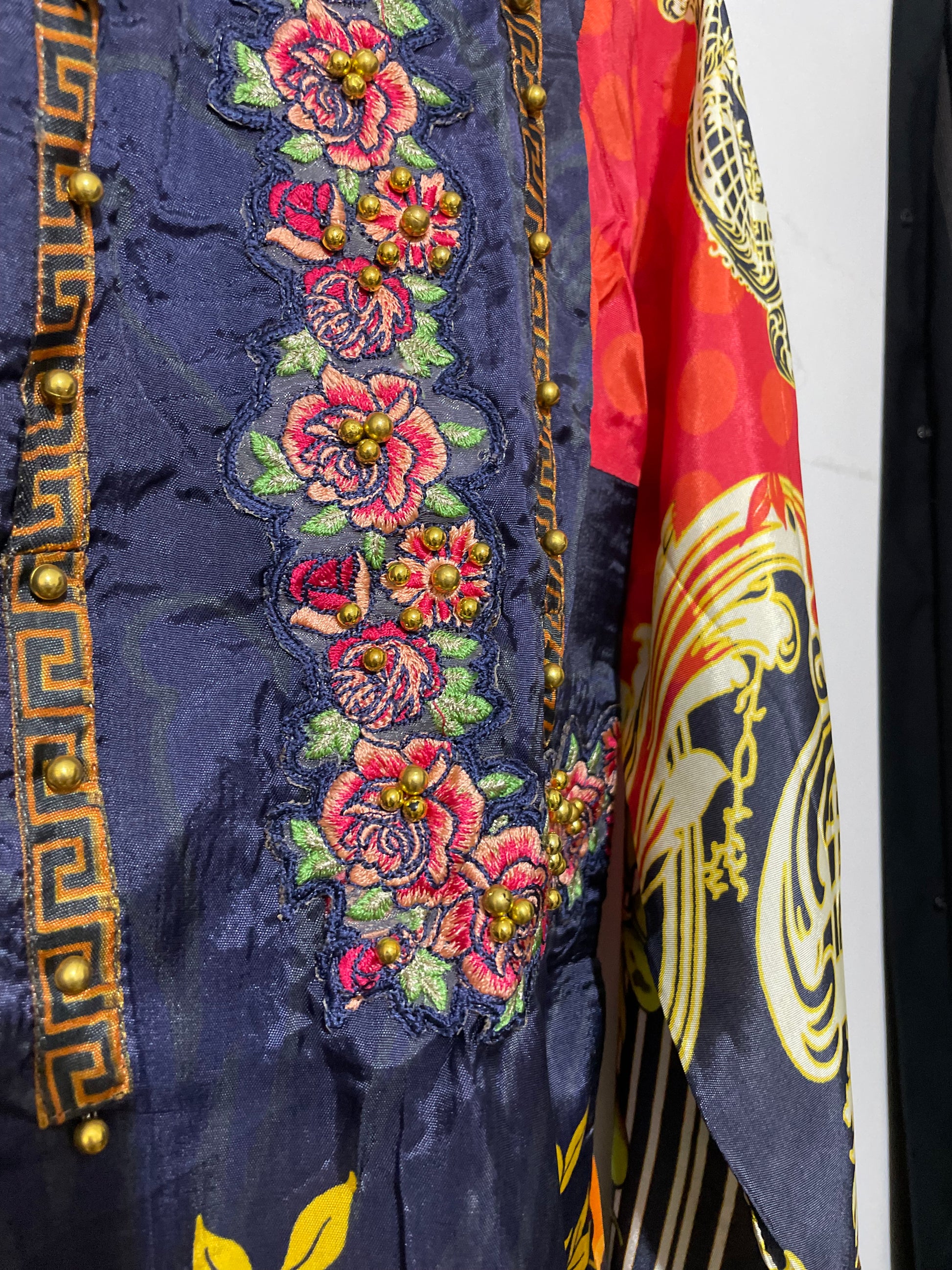 Satin silk , heavy embroiderybon the chest , with floral dangling on the lace border and sleeves